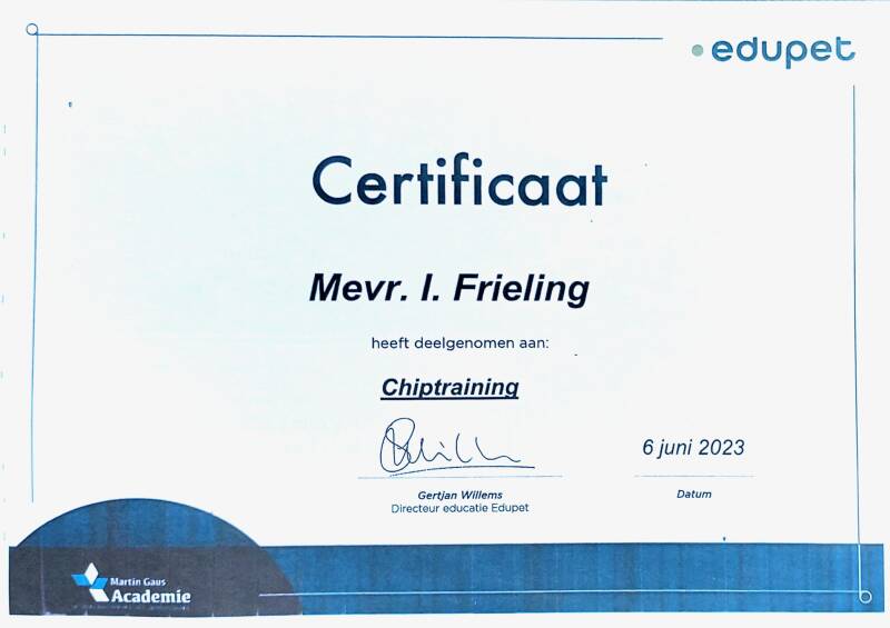 Nadat de chip is geplaatst, wordt alle informatie op een formulier ingevuld, die wordt gekoppeld aan het nummer van de ingebrachte chip. Dit formulier neem ik mee, en ik zal de chip voor de eigenaar registreren in de database Petbase. De eigenaar krijgt direct na registratie een email van Petbase, dat de chip is geregistreerd. Je kunt dan eventuele wijzigingen via je account wijzigen. Petbase is aangesloten bij Europetnet, waardoor je huisdier na vermissing in heel Europa op te sporen is. Meer info kun je vinden op www.petbase.eu