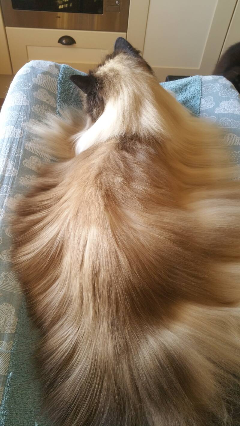 In principe trim ik de kat alleen, maar is het soms wel handig als de eigenaar helpt bij het afleiden of geruststellen van de kat.